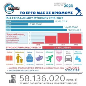 Η Μύκονος διαχειρίζεται την ευημερία και τον πλούτο της και όχι την φτώχεια και την ανέχειά της. Και τη διαχειρίζεται με ρεαλιστικό και ολοκληρωμένο σχεδιασμό.Την περίοδο 2019 -2023 δαπανήθηκαν πάνω από 58 εκατομμύρια ευρώ για έργα και υπηρεσίες στο νησί. Από αυτά αξιοποιήθηκαν: τα 5,9 εκατ. ευρώ στην καθαριότητα, τα 17 εκατ. ευρώ στην ύδρευση και αποχέτευση, τα 11,4 εκατ. ευρώ στα λιμάνια, τα 7,4 εκατ. ευρώ στο οδικό δίκτυο, τα 3,1 εκατ. ευρώ στην εκπαίδευση, τα 3,6 εκατ. ευρώ στον πολιτισμό, 725 χιλιάδες ευρώ στην υγεία και συνεχίζουμε.