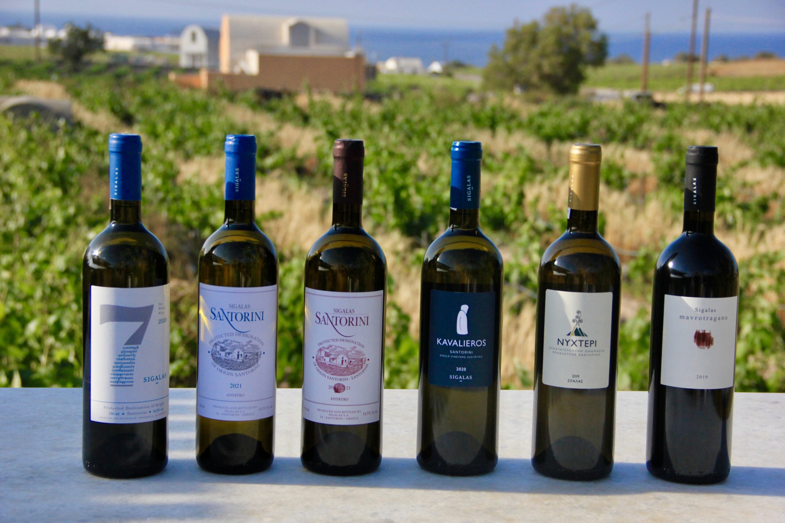 Στην πλούσια γκάμα κρασιών του οινοποιείου ιδιαίτερο ενδιαφέρον έχει το 7 ή 7 Χωριά, όπως είναι ευρύτερα γνωστό. Ένα κρασί, που διατίθεται προς πώληση μόνο στο οινοποιείο, για την δημιουργία του οποίου οινοποιούνται ξεχωριστά σταφύλια από επτά χωριά της Σαντορίνης – Οία, Φηρά, Ημεροβίγλι, Βουρβούλος, Μεγαλοχώρι, Πύργος και Ακρωτήρι. Εμφιαλώνονται μόνο τα κρασιά που κρίνονται ως καλύτερα της κάθε χρονιάς. Πάνω, δε, στη φιάλη αναγράφεται και το όνομα του συγκεκριμένου χωριού από το οποίο προήλθαν τα σταφύλια. Εξαίσιος και ο Καβαλιέρος, ένα κρασί ορόσημο για το οινοποιείο με γεμάτο στόμα, υψηλή οξύτητα και αρώματα εσπεριδοειδών και μελιού. Στις ερυθρές ετικέτες, υπέροχο είναι το Μαυροτράγανο του κτήματος και πολύ ιδιαίτερο το Μμ που συνδυάζει τις δυο γηγενείς ποικιλίες του νησιού, το Μαυροτράγανο και τη Μανδηλαρία, δίνοντας ένα κρασί πλούσιο στο στόμα αλλά και ισορροπημένο, με αρώματα κόκκινων φρούτων και μπαχαρικών. Αξίζει να σημειωθεί ότι το Κτήμα Σιγάλα και το Οινοποιείο Αρτέμης Καραμολέγκος είναι τα μοναδικά οινοποιεία του νησιού που καλλιεργούν το Μαυροτράγανο όρθιο σε σύρμα.