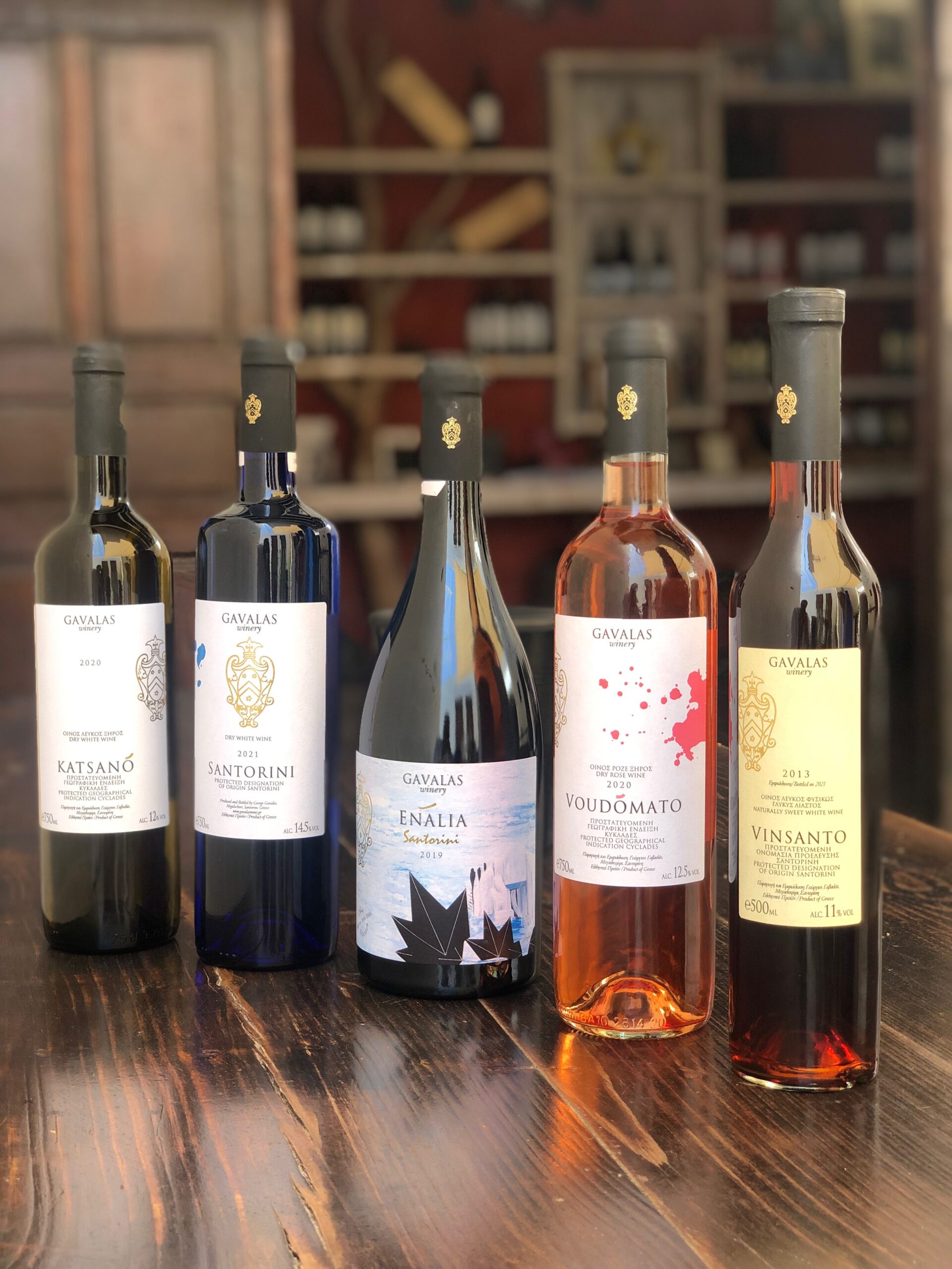 Τα κρασιά του παράγονται από βασικές ποικιλίες του νησιού, όπως Ασύρτικο, Αηδάνι, Μαντηλαριά και Μαυροτράγανο αλλά και από πιο σπάνιες ποικιλίες, μερικές από τις οποίες καλλιεργούνται μόνο στο Οινοποιείο Γαβαλάς, όπως το Κατσανό. Ένα κρασί ελαφρύ και ευκολόπιοτο με αρώματα λευκών λουλουδιών αλλά και τροπικών φρούτων που, εκτός από Κατσανό, περιέχει σε πολύ μικρή ποσότητα (15%) και μία ακόμη σπάνια ποικιλία, τη Γαϊδουριά. Εκπληκτική και η Σαντορίνη του οινοποιείου με αρώματα λεμονιού και ροδάκινου που ισορροπούν την τυπική ορυκτότητα του Ασύρτικου. Παρουσιάζεται μέσα σε μπλε φιάλη που, όπως λένε οι παραγωγοί, συμβολίζει το χρώμα της θάλασσας που αγκαλιάζει το νησί. Τέλος στις premium και περιορισμένης παραγωγής φιάλες, αφού κυκλοφορούν μόλις 1,300 το χρόνο, είναι το Enalia. Ένα κρασί που πρωτοεμφανίστηκε στην αγορά το 2019, με αρώματα ώριμων πυρηνόκαρπων φρούτων και έντονα ορυκτό και τανικό στοιχείο.