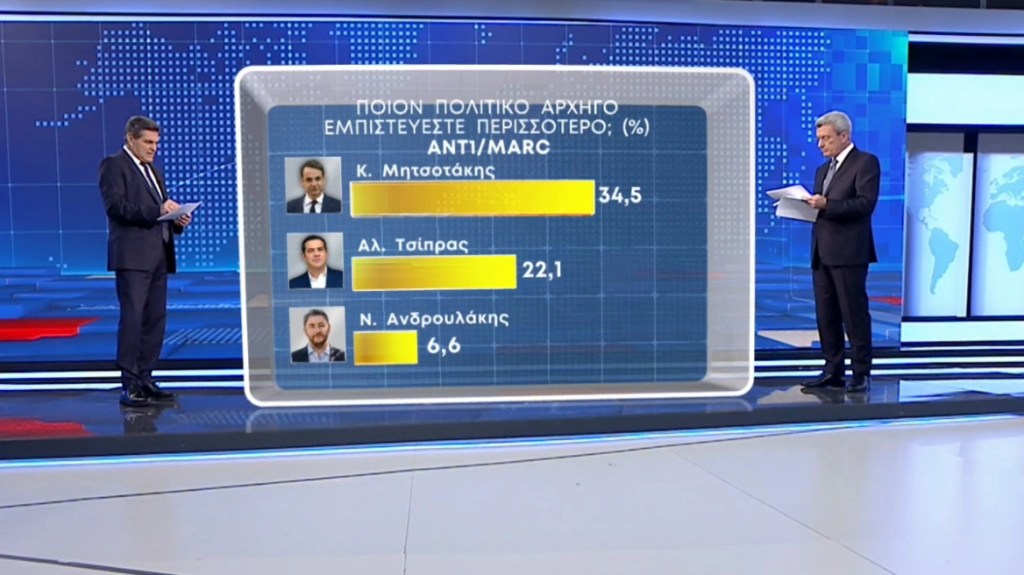 Στο ερώτημα ποιον πολιτικό αρχηγό εμπιστεύεστε περισσότερο, ο Κυριάκος Μητσοτάκης προηγείται με 12,4 μονάδες έναντι του αρχηγού της αξιωματικής αντιπολίτευσης. Συγκεκριμένα ο κ. Μητσοτάκης λαμβάνει ποσοστό 34,5%, ο Αλέξης Τσίπρας 22,1% και στην τρίτη θέση ακολουθεί ο Νίκος Ανδρουλάκης με 6,6%.